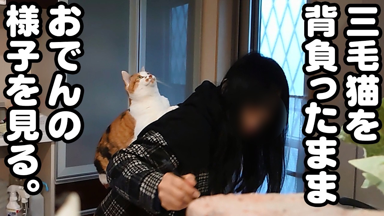 三毛猫を背負ったまま😸おでんの様子を見る🍢 #猫 #ねこ #neko #cats #三毛猫 #おんぶ #cat