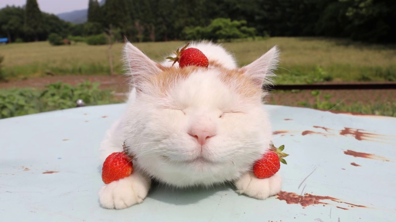 3つのいちごを乗せたしろ Cat and strawberry 2018