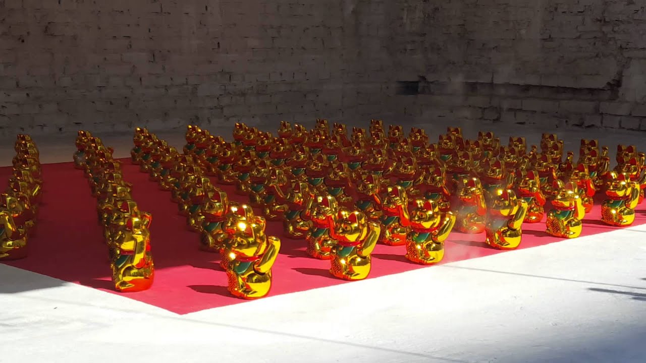 撫でているのか身体を掃除しているのか、ほうきで背中を掃かれるまちねこ。猫は少し迷惑がっているようにも見えるが・・・。