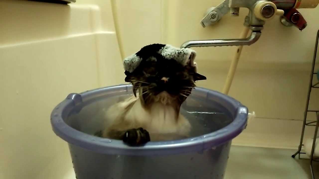ネコ、初めてのバケツでお風呂-cat backet the bath –