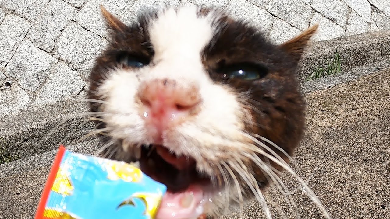 パウチしか食べない猫にカルカン(kalkan)のたい入りにちゅ~るをあえたらすごい勢いで食べた 野良猫 感動猫動画